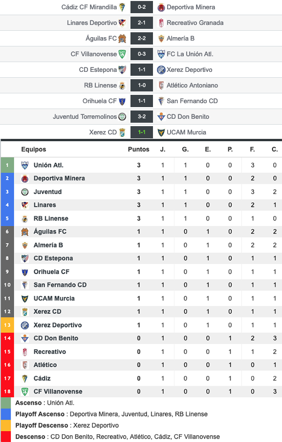 El grupo, curiosamente, está encabezado tras la primera jornada por los dos equipos representativos de tierras mineras, las localidades vecinas de La Unión y El Llano del Beal (Deportiva Minera).