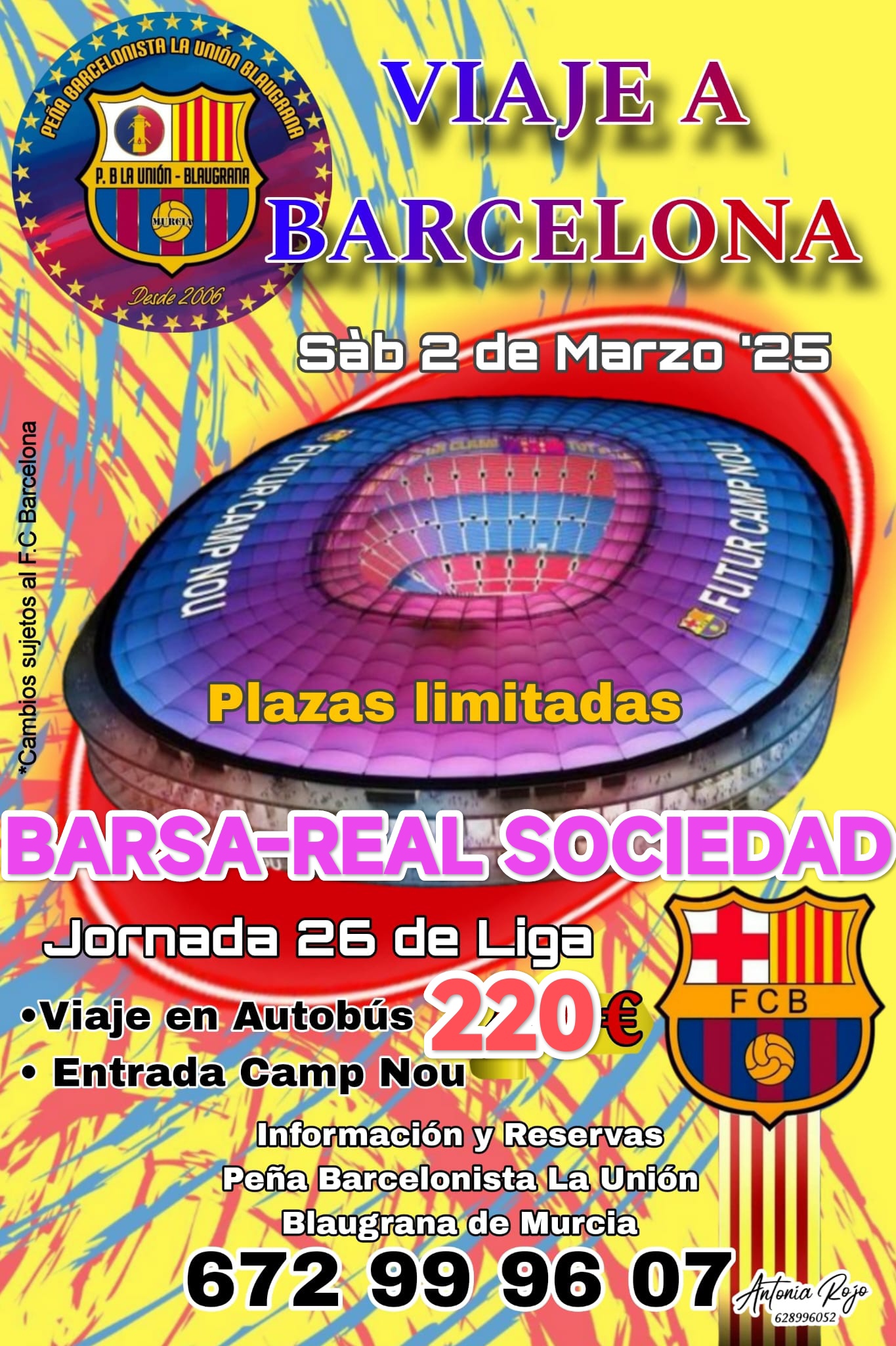 Peña Barcelonista La Unión Blaugrana prepara un desplazamiento al estadio del Fútbol Club Barcelona para el 2 de marzo del próximo año, para asistir al partido del equipo azulgrana frente a la Real Sociedad de la jornada 26 de la primera división del fútbol profesional. El viaje y la entrada al estadio cuestan 220 euros por personas. Plazas limitadas.