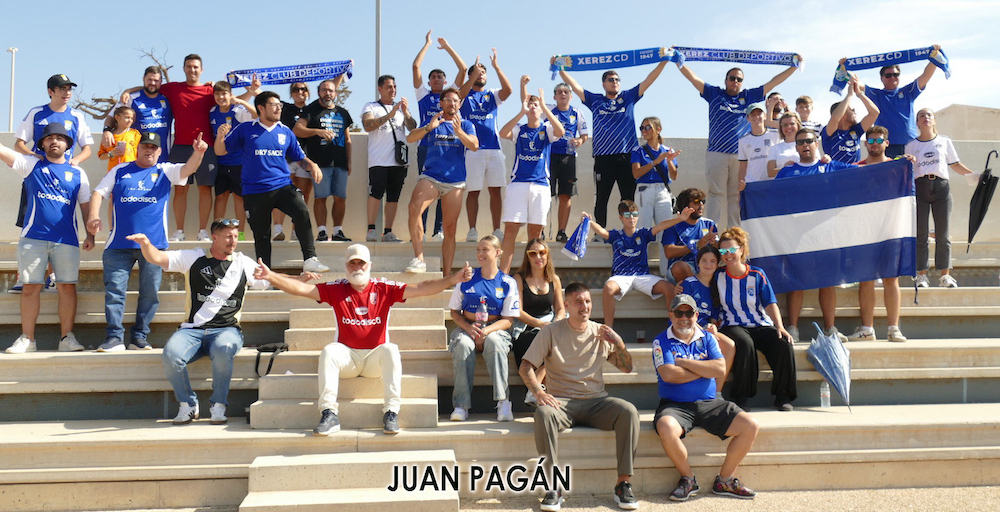 ✍️ Afición visitante. Unos cuarenta seguidores tuvo el Xerez en la grada, menos de lo esperado, pues habían pedido un centenar de entradas a principio de semana. No eran tantos, pero sí muy ruidosos.