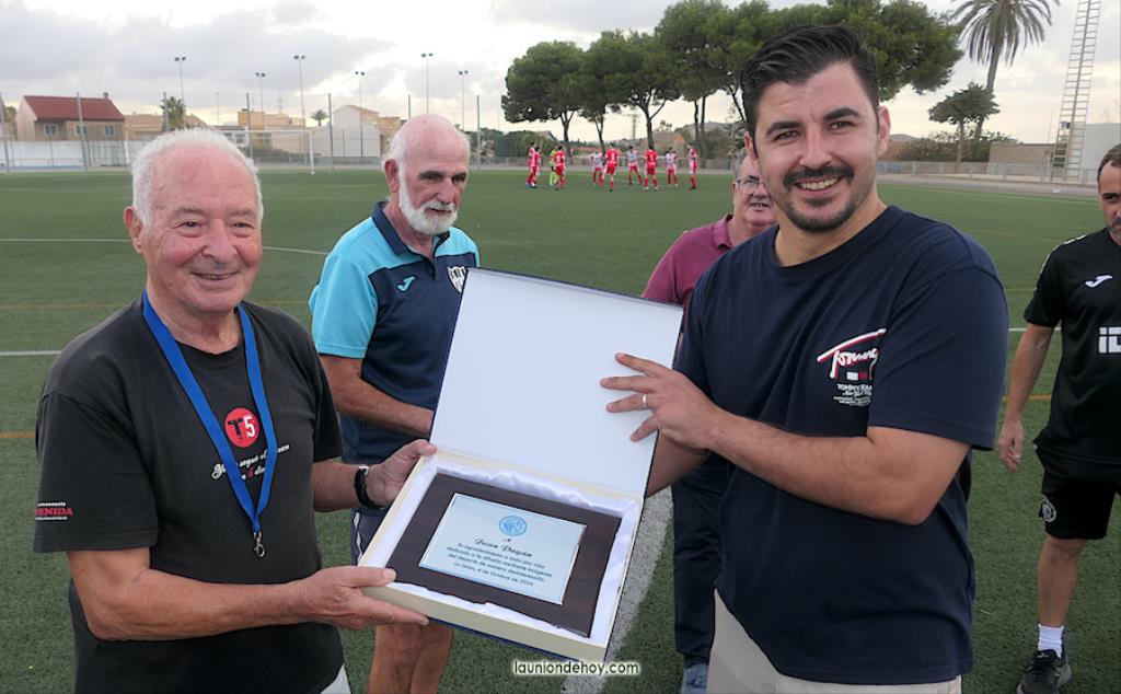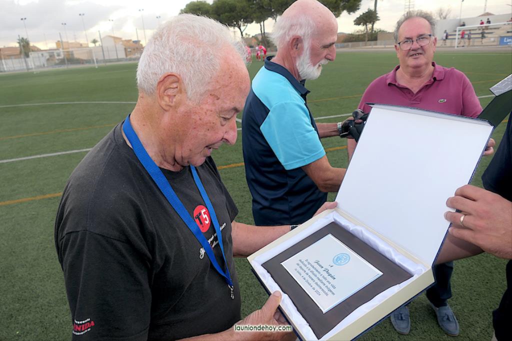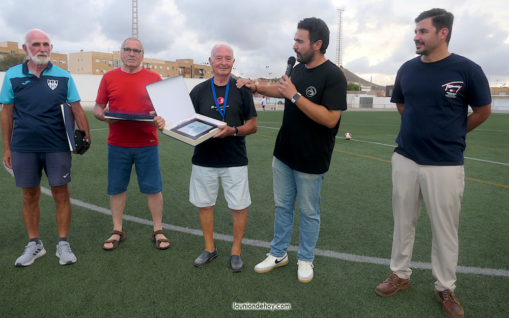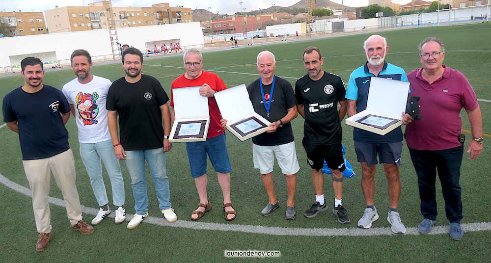 Los homenajeados fueron Diego Carrasco ‘Kubala’ y Miguel Jorquera, a quienes pilló sentados en la grada, y a Juan Pagán Rivas, quien estaba delante del presidente tomándole fotografías. El reconocimiento a los tres es por ser unionense de larga vinculación a balompié minero, unos dentro de clubes y otro, en el caso de Pagán, divulgando lo que han hecho diferentes equipos de La Unión.