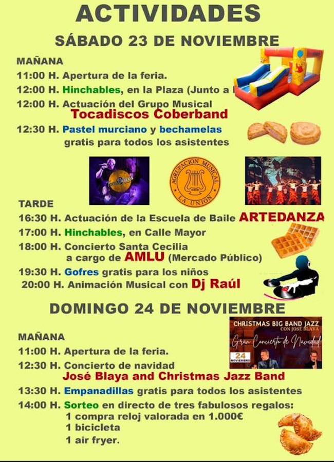 La miel y el cine abren la agenda esta tarde, mientras que el sábado es para el almuerzo campero que cerrará la semana cultural de las mujeres de El Garbanzal y para el concierto en honor a la patrona de la música, además del inicio de una animada 'Feria Outlet' prenavideña que se prolongará al domingo por la mañana. En el deporte juegan como locales los dos máximos representantes del fútbol y también ofrecemos fecha, horarios y escenarios para los equipos de base del CD Vedruna de fútbol sala, CB Sierramar de baloncesto y Surmenor de voleibol femenino, donde uno de los partidos se juega en Roche. También hay un torneo de fútbol base en Portmán.