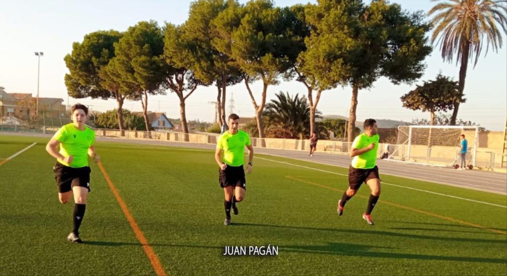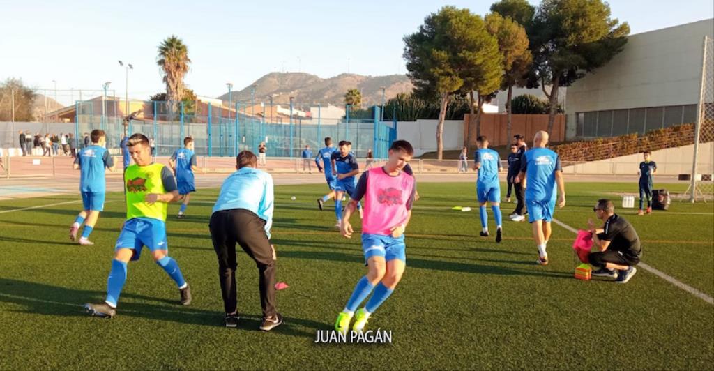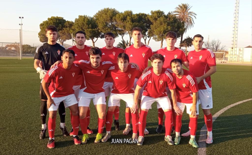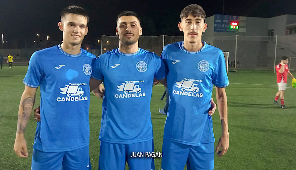 El equipo minero de segunda autonómica de fútbol resuelve con una goleada el partido frente al Real Murcia C con dianas de Indio, Villa y doblete de Aday. En la imagen, los tres goleadores.