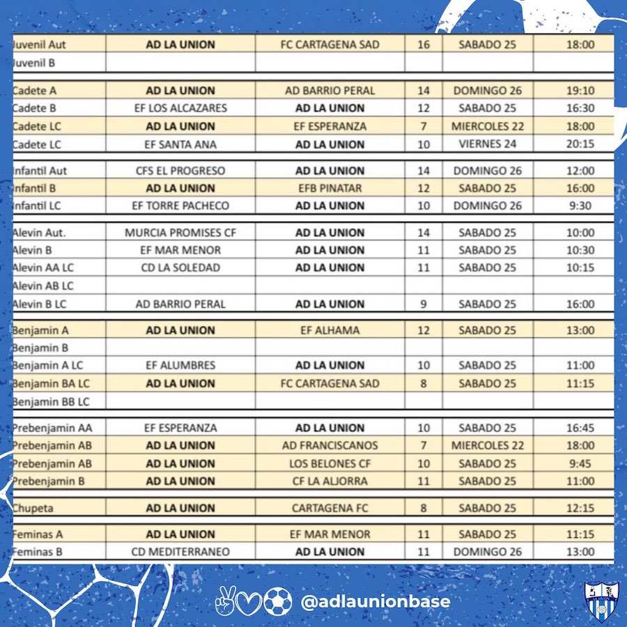 La agenda se activa esta misma tarde con un recital poético dedicado a María Cegarra en el Museo Minero, un partido de fútbol sala en el pabellón Ramón Solano y un baile en el centro de mayores. El domingo, por su parte, doble cita en el campo Miguel Expósito con La Unión Atlético por la mañana y el Ciudad por la tarde. Ofrecemos también los horarios de todos los conjuntos que compiten del CB Sierramar, CD Vedruna, AD La Unión y Surmenor, que jugará dos partido en Roche.