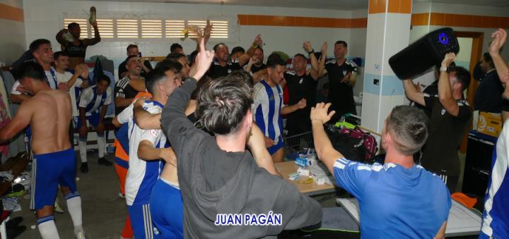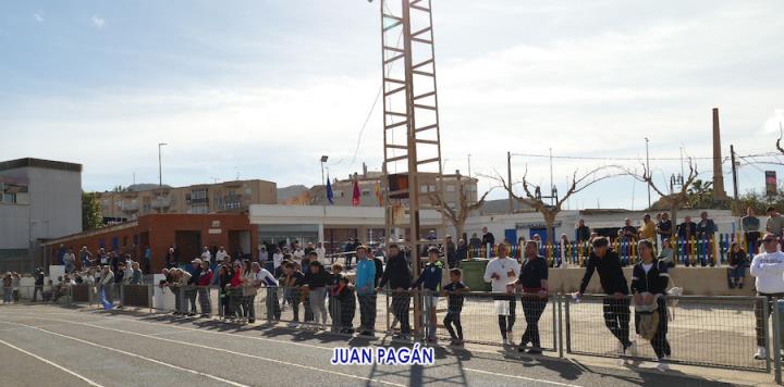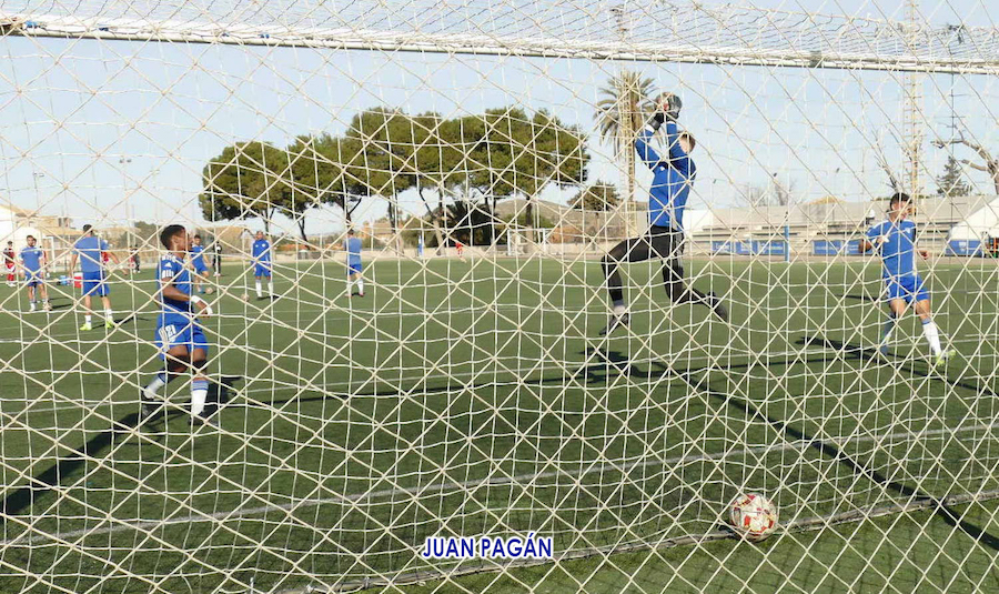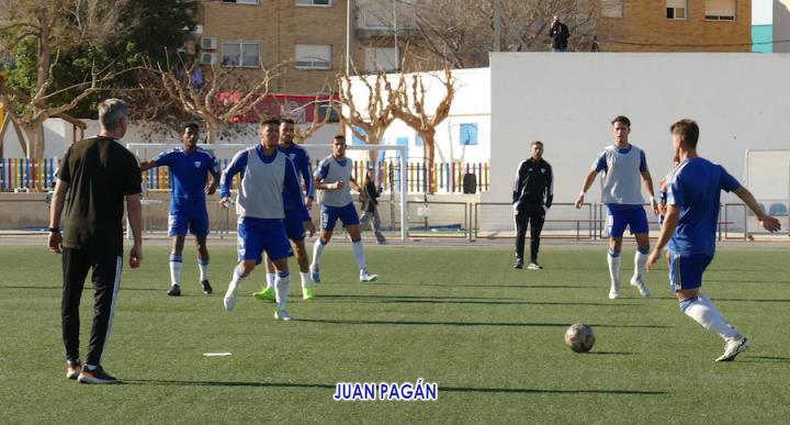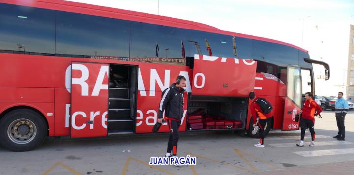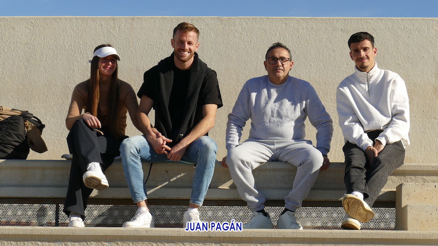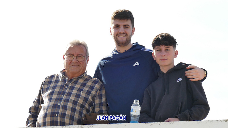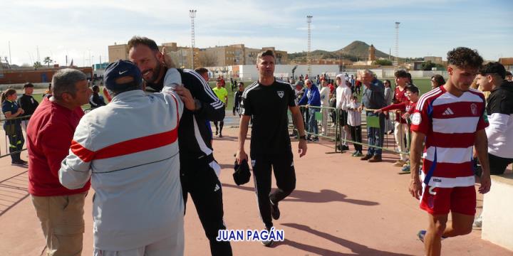 Juan Pagán ofrece un reportaje gráfico de lo acaecido fuera del terreno de juego en la contiende futbolística entre La Unión Atlético y el Recreativo de Granada, incluidos los calentamientos previos de los dos equipos y del trío arbitral, además de espectadores en diferentes puntos del estadio Miguel Expósito.