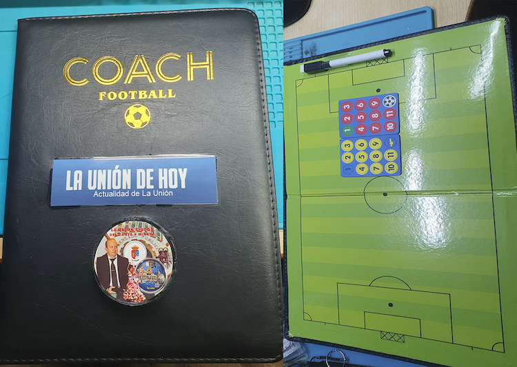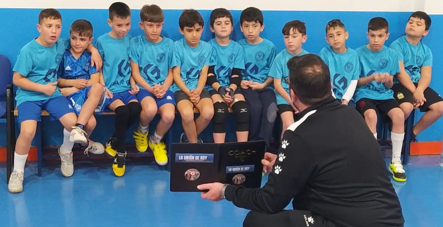 Juanmi García Cañavarte ya utiliza con los jugadores de categoría benjamín del CD Vedruna la carpeta de entrenador que, por iniciativa y gestión de Juanjo Carrillo, la obsequiado la-union-ciudad-del-cante-y-minera.es y www.launiondehoy.com para facilitar las enseñanzas e indicaciones a los jugadores de fútbol sala, pues dispone de una pizarra imantada con forma de pista de juego.