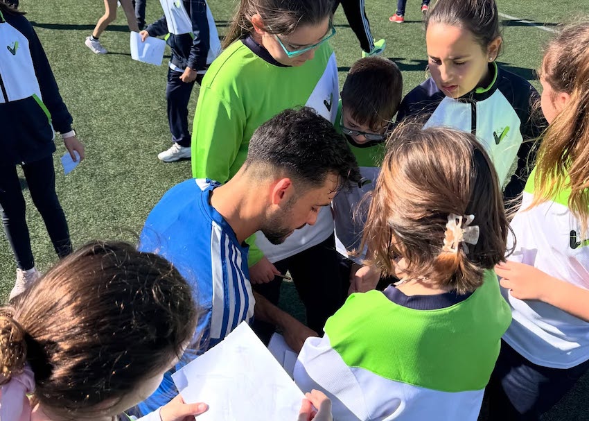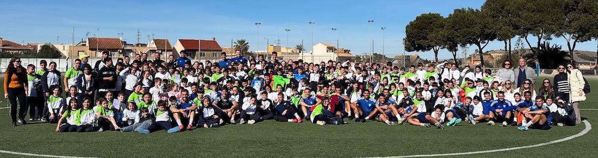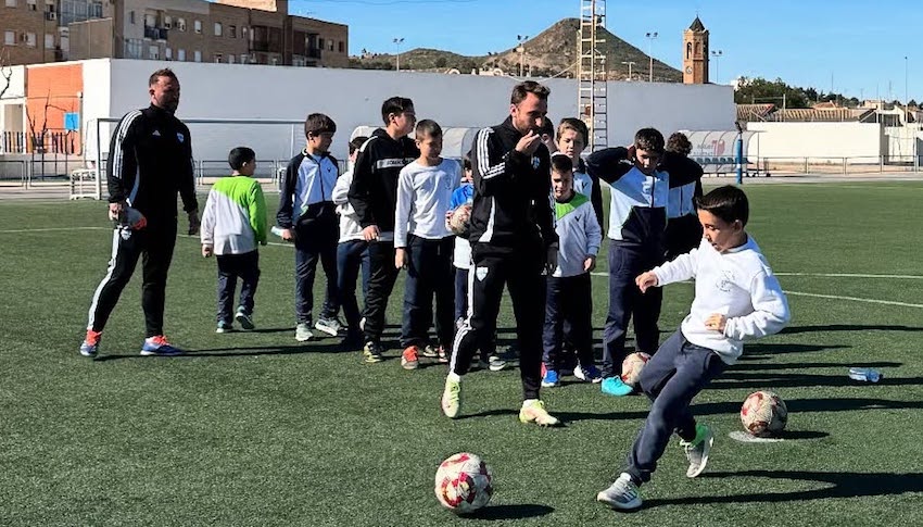 Alumnos del colegio de Nuestra Señora del Carmen pasaron una muy agradable mañana de risas, autógrafos y fútbol en el campo de fútbol Miguel Expósito con la plantilla del equipo minero que encabeza el grupo cuarto de la Segunda RFEF.