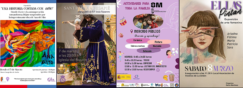 Intenso viernes con homenaje a la hermana Carmen Peralta, exposición en Roche, honores al Nazareno, tamborada callejera y partido de baloncesto en la ciudad de La Unión. El sábado, con el 8M de fondo, trae fiesta familiar en el Mercado Antiguo y exposición con música y taichí en el local vecinal. La Semana Santa Minera cogerá el protagonismo en la mañana dominical, que recuperará la 'Llamada' y presentará el cartel de este año. En deportes, viajan La Unión Atlético y CD Ciudad de La Unión. También ofrecemos fechas, horarios y rivales del CD Vedruna de fútbol sala y CB Sierramar.
