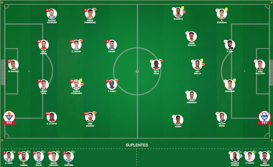 DON BENITO. Moha; Tapia, Lolo Pavón, Razvan, Dabo (Vesprini, minuto 86), Iturraspe (Mario Sánchez, 85), Rosón (Dani Salas, 71), Emmanuel, Dabo, Inach (Raly Cabral, 62) Oussama y Erik Aguado (Vera, 62).