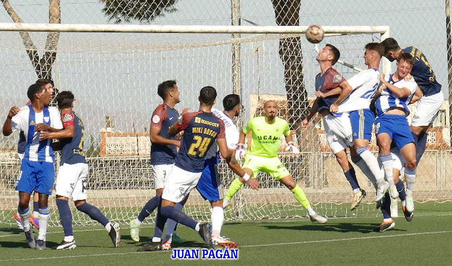 La Unión Atlético, sorprendente y brillante líder del grupo cuarto de Segunda RFEF, visita al UCAM Murcia, que va tercero y fue concebido como un 'gallito' de la categoría, se enfrenta este domingo en La Condomina. Está cerca de completarse el segundo autocar de aficionados que irá a la capital de la Sierra Minera a la capital del Segura. El encuentro será televisado por Popular TV. Foto del partido de la primera vuelta