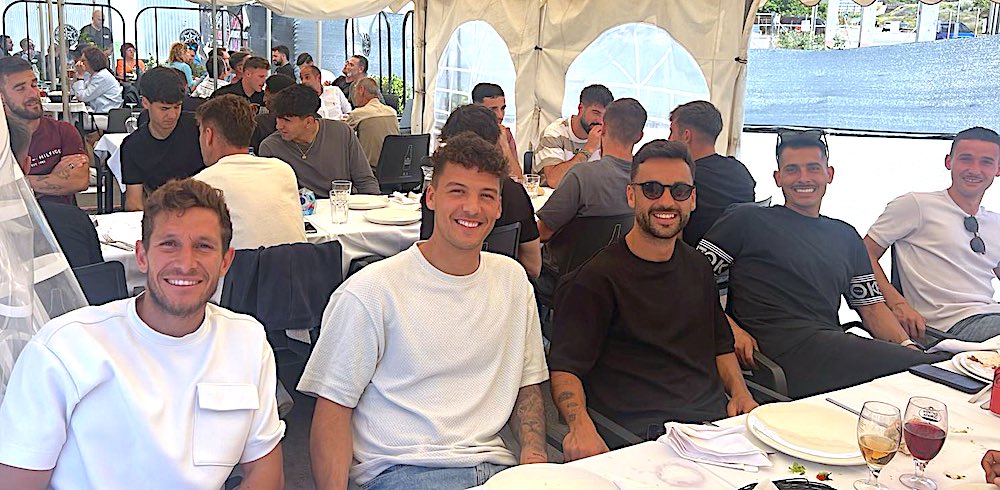 El entrenador de La Unión Atlético, en entrevista en Onda Regional, también destaca que vino de la mano de Quinín y que juntos efectuaron los fichajes. "No sólo con dinero se hace una gran plantilla y este vestuario tiene ambición y ganas". En la foto, jugadores, técnicos y demás personal del club en una comida de hermandad de esta semana.