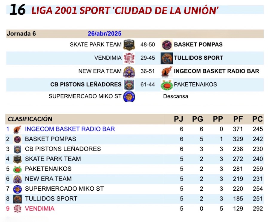 'Basket Pompas' ganó con apretado marcador a 'Skate Park Team' y es el único que mantiene el fuerte ritmo de 'Ingecom Basket', que sigue líder e invicto. Destacar la igualdad en el resto de formaciones, pues entre el tercer clasificado y el penúltimo sólo hay una victoria de diferencia.