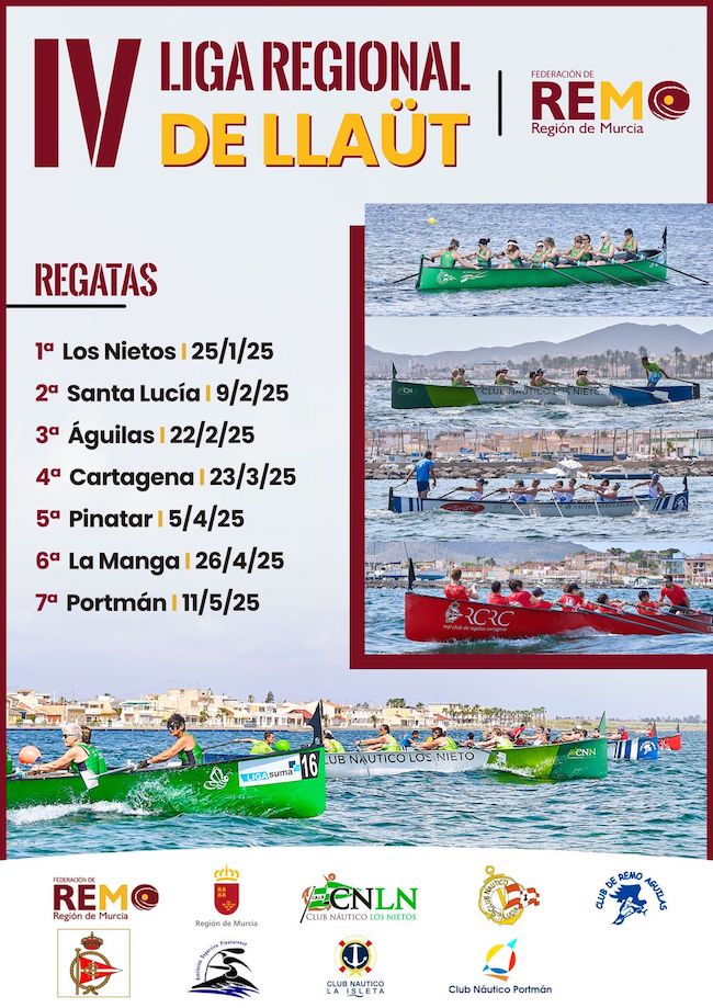 El domingo 11 de mayo se celebrará la séptima y decisiva regata de la cuarta edición de la liga de llaüt que organiza la Federación de Remo de la Región de Murcia. En la foto, el equipo del Club Náutico de Los Nietos en la prueba celebrada el domingo en La Manga, donde quedó en segunda posición.