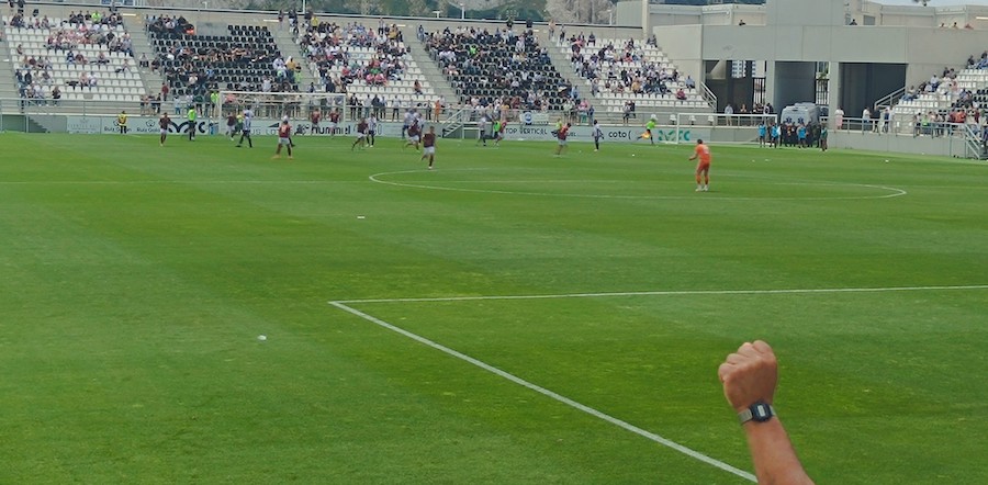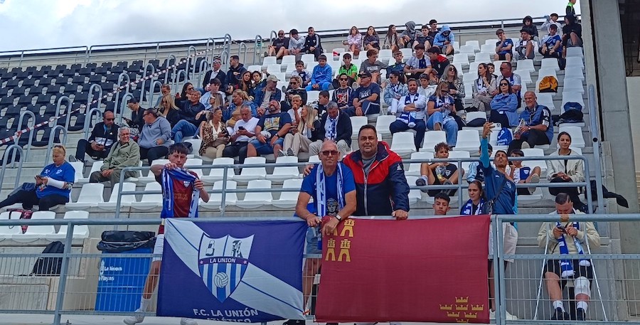 "Una vez en tierras de la Línea de la Concepción, nos hemos encontrado con unas gotas de lluvia al llegar, para enseguida ubicarnos en la grada junto a los aficionados llegados desde La Unión, 54 en el autocar fletado por el club y unos quince en vehículos particulares. Pocos, pero ruidosos en un estadio que ha acogido a 2.413 personas sentadas, pues la ilusión de la afición del municipio minero era muy grande