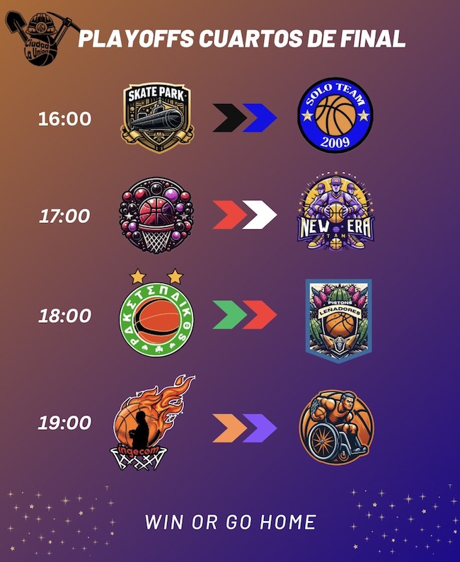 Ingecom Basket-Tullidos Sport, Basket Pomas-New Era Team, Paketenaikos-Pistons Leñadores y Skate Park-Supermercado Miko son los emparejamientos de cuartos de final de la liga local de baloncesto que se disputan este sábado en 'La Bombonera' y los vencedores se clasificarán para la 'final a cuatro' del 14 y 15 de junio.