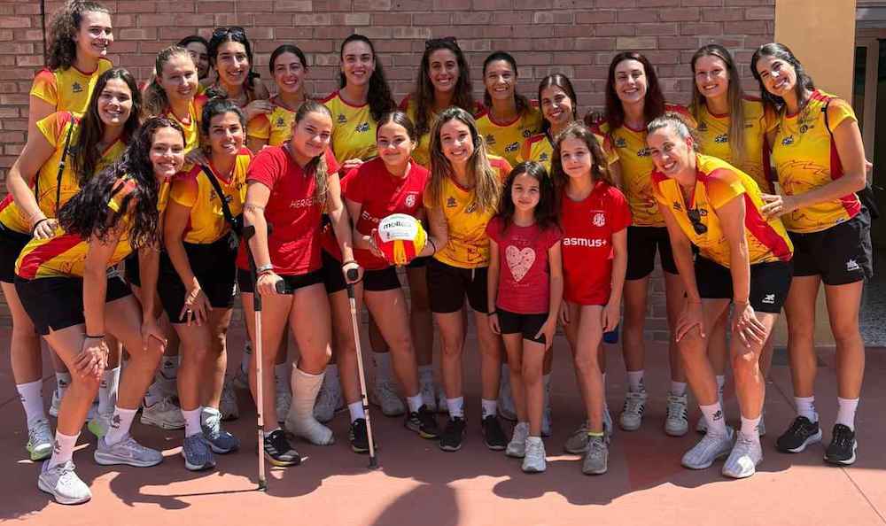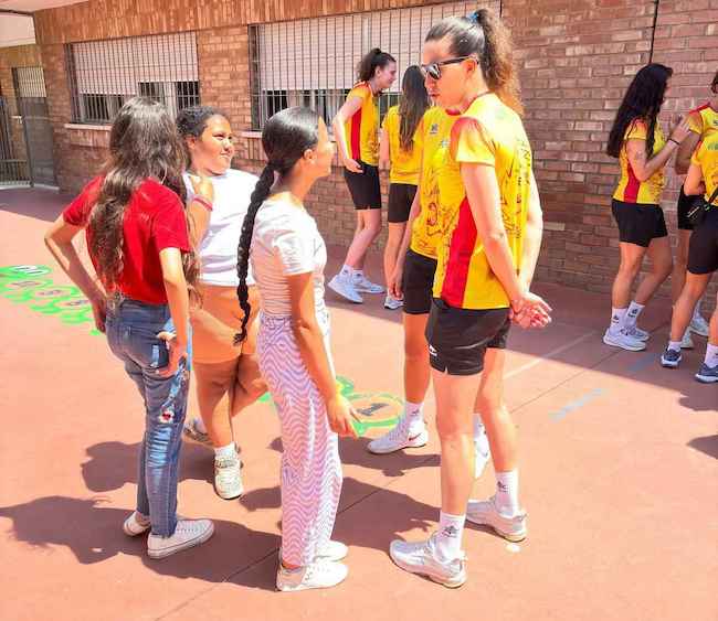 La líbero unionense del Unicaja Andalucía de Sevilla de la máxima categoría del voleibol nacional, ha estado hoy con sus compañeras de la selección española en el colegio Herrerías, donde ha compartido un tiempo muy agradable con los alumnos de sexto de primaria y los docentes. El equipo está concentrado en el CAR de Los Narejos preparando la 'European Golden League', en al que debutarán este viernes en Montenegro. En la foto se observa a la unionense de amarillo junto al balón