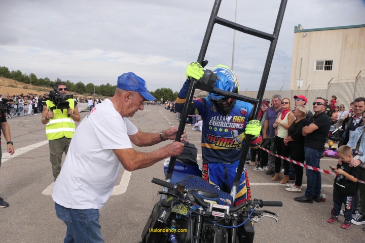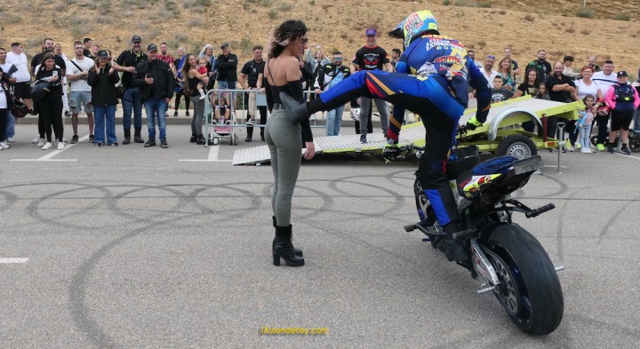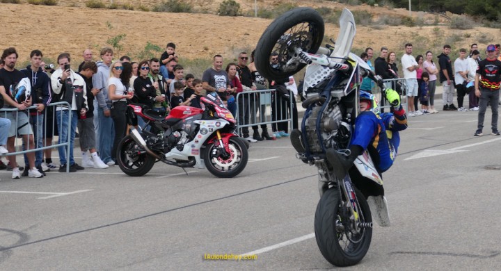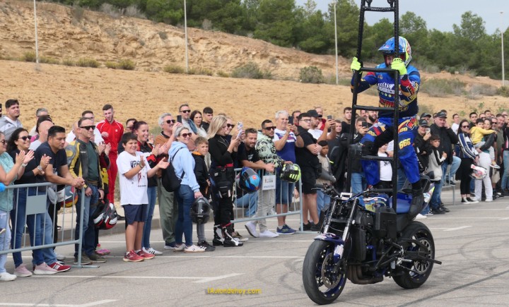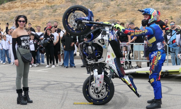 Las fotos adjuntas son un ejemplo de la riqueza de acrobacias ofrecidas sobre las motos, las cuales ha enriquecido en un momento determinado haciándolas alrededor de una joven inmóvil, además de ofrecer dos grandes saltos y de rodar sobre sí mismo en una moto preparada para ejercer de 'rueda'.