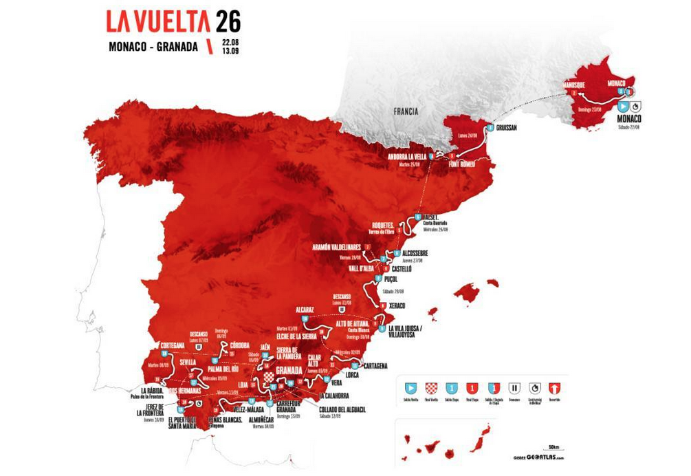 La Vuelta 26 ha desvelado su recorrido para el próximo año, siendo llamativo que centra sus etapas junto al Mediterráneo y Andalucía. La presentación tuvo lugar en el 'Sporting Club' de Mónaco, lugar donde se disputará la etapa inaugural, siendo Carlos de Andrés y Perico Delgado, comentaristas de TVE, quienes dieron a conocer las jornadas. VÍDEO DEL RECORRIDO: pinchar aquí