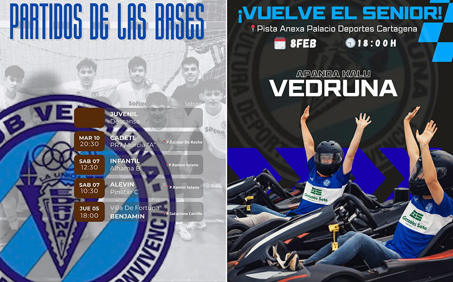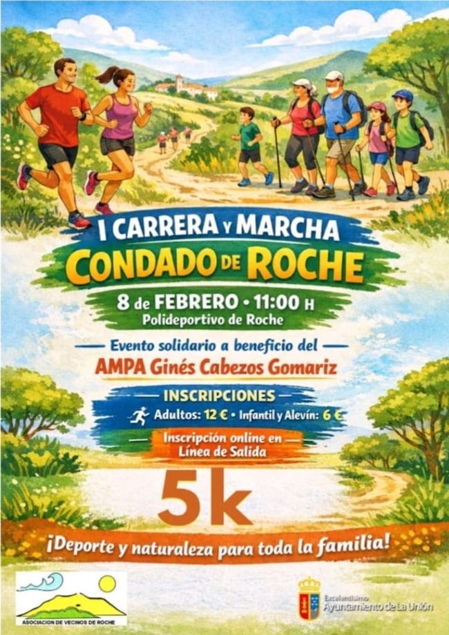 El condado de Roche estrena este domingo carrera y marcha popular, cuyo plazo para apuntarse acaba hoy. En cuanto a equipos mayores, viajan el CB Sierramar y el CD Vedruna, siendo el CD Ciudad de La Unión el único que juega como local y lo hará cambiando el horario de la tarde a la mañana dominical. Ofrecemos agenda de los equipos de base de baloncesto, fútbol sala y voleibol. Fuera del deporte, este sábado hay cuentacuentos en la biblioteca Andrés Cegarra.