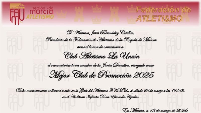 La Federación de Atletismo de la Región de Murcia otorga el galardón de 'Mejor club de promoción de 2025' al club unionense por su labor de cantera durante el pasado año, la cual enriqueció con brillantes resultados deportivos, como fue el campeonato regional sub-14 logrado en verano por el equipo femenino (foto adjunta).