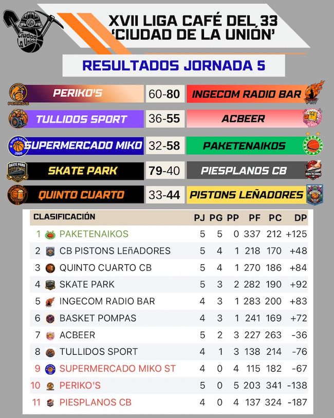 Quinto Cuarto CB sufrió la primera derrota al caer ante CB Pistons Leñadores, que ahora lo supera para ocupar la segunda plaza tras una quinta jornada de la XVII edición celebrada en ‘La Bombonera’ de La Unión. El torneo descansa este fin de semana con motivo de la Semana Santa.