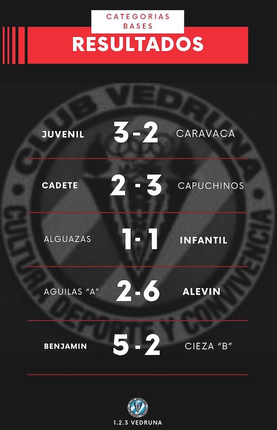 Primera alevín. Dos veces tuvo que remontar CD Vedruna, pues en los primeros minutos estuvo con los marcadores adversos de 1-0 y 2-1, pero luego fue a más y acabó venciendo con autoridad, lo que permite al conjunto seguir segundo en la tabla con 42 puntos, teniendo lejos al líder (Alcantarilla, con 51) y amenazante al Pinatar (40).