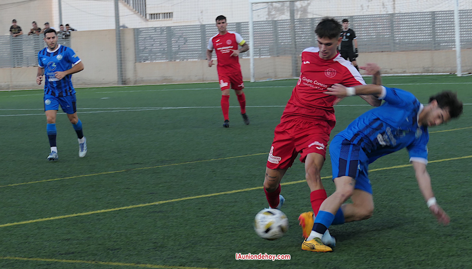 CD Ciudad de La Unión se adelantó en el marcador con un gran gol de Aday (foto superior mientras es felicitado por sus compañeros), pero el CD Mediterráneo reaccionó tras empatar de penalti y firma una 'manita' ante un rival que quedó diezmado a los 50 minutos de juego.