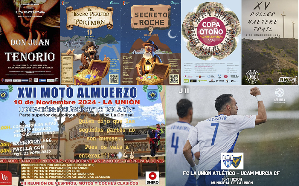 Muchas propuestas, especialmente deportivas con el trofeo ciclista del sábado, el trail del domingo y los partidos del CD Vedruna de fútbol sala, Surmenor de voleibol femenino y del fútbol con salida del Ciudad de La Unión, mientras que el líder visita a La Unión Atlético. El domingo tendrá lugar el motoalmuerzo motero en el polígono industrial. Además, actividades infantiles en Roche y Portmán. En este pueblo costero hoy se despide 'Don Juan Tenorio'.