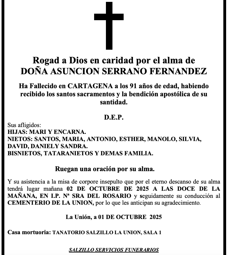 Sus afligidos hijas (Mari y Encarna), nietos (Santos, María, Antonio, Esther, Manolo, Silvia, David, Daniel y Sandra), bisnietos, tataranietos y demás familia ruegan una oración por su alma y su asistencia a la misa de 'corpore insepulto' que por el eterno descanso de su alma tendrá lugar este jueves, 2 de octubre de 2025, en la iglesia parroquial de Nuestra Señora del Rosario y, seguidamente, a su conducción al cementerio de La Unión, por lo que les anticipan su agradecimiento.