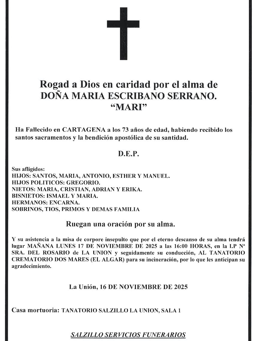 Sus afligidos hijos (Santos, Antonio, Esther y Manuel), hijos políticos (Gregorio), nietos (María, Cristian, Adrián y Erika), bisnietos (Ismael y María), hermanos (Encarna), sobrinos, tíos, primos y demás familia ruegan una oración por su alma y su asistencia a la misa de 'corpore insepulto' que por el eterno descanso de su alma tendrá lugar este lunes, 17 de noviembre, a las cuatro de la tarde en la iglesia parroquial de Nuestra Señora del Rosario de La Unión y, seguidamente, a su conducción al tanatorio Dos Mares de El Algar para su incineración, por lo que les anticipan su agradecimiento.