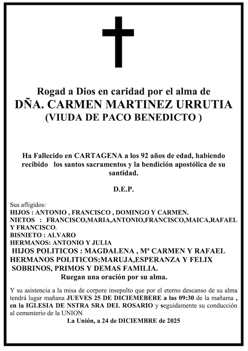 Sus afligidos hijos (Antonio, Francisco, Domingo y Carmen), nietos (Francisco, María, Antonio, Francisco, Maica, Rafael y Francisco), bisnieto (Álvaro), hermanos (Antonio y Julia), hijos políticos (Magdalena, Mª Carmen y Rafael), hermanos políticos (Maruja, Esperanza y Félix), sobrinos, primos y demás familia ruegan una oración por su alma y su asistencia a la misa de 'corpore insepulto' que por el eterno descanso de su alma tendrá lugar este jueves, 25 de diciembre, a las 9.30 horas, en la iglesia de Nuestra Señora del Rosario de La Unión y, seguidamente, a su conducción al cementerio de la misma localidad.