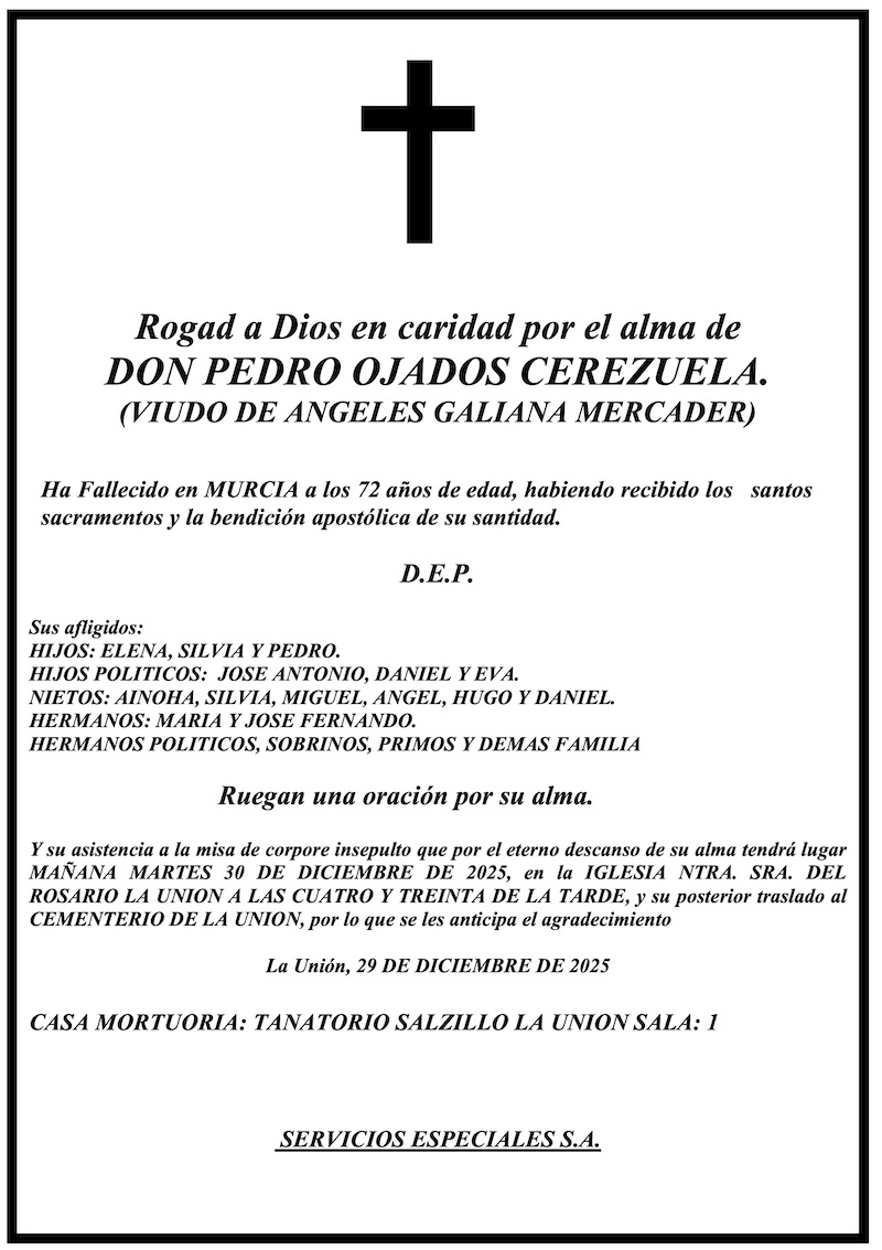 Sus afligidos hijos (Elena, Silvia y Pedro), hijos políticos (José Antonio, Daniel y Eva), nietos (Ainhoa, Silvia, Miguel, Ángel, Hugo y Daniel), hermanos (María y José Fernando), hermanos políticos, sobrinos, primos y demás familia ruegan una oración por su alma y su asistencia a la misa de 'corpore insepulto' que, por el eterno descanso de su alma, tendrá lugar este martes, 30 de diciembre de 2025, en la iglesia de nUestra Señora del Rosario de La Unión a las 16.30 horas y a su posterior traslado al cementerio de la misma localidad, por lo que se les anticipa el agradecimiento.
