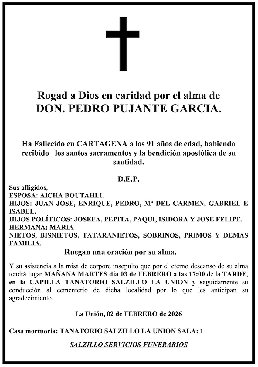 Sus afligidos esposa (Aicha Boutahli), hijos (Juan José, Enrique, Pedro, María del Carmen, Gabriel e Isabel), hijos políticos (Josefa, Pepita, Paqui, Isidor y José Felipe), hermana (María), nietos, bisnietos, tataranietos, sobrinos, primos y demás familia ruegan una oración por su alma y su asistencia a la misa de 'corpore insepulto' que por el eterno descanso de su alma tendrá lugar este martes, 3 de febrero, a las cinco de la tarde, en la capilla del Tanatorio Salzillo La Unión y, seguidamente, a su conducción al cementerio de dicha localidad, por lo que les anticipan su agradecimiento.