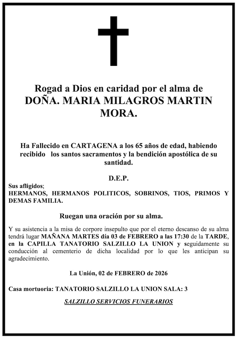Sus afligidos hermanos, hermanos políticos, sobrinos, tíos, primos y demás familia ruegan una oración por su alma y su asistencia a la misa de 'corpore insepulto' que por el eterno descanso de su alma tendrá lugar este martes, 3 de febrero, a las cinco y media de la tarde, en la capilla del Tanatorio Salzillo La Unión y, seguidamente, a su conducción al cementerio de dicha localidad, por lo que les anticipan su agradecimiento.