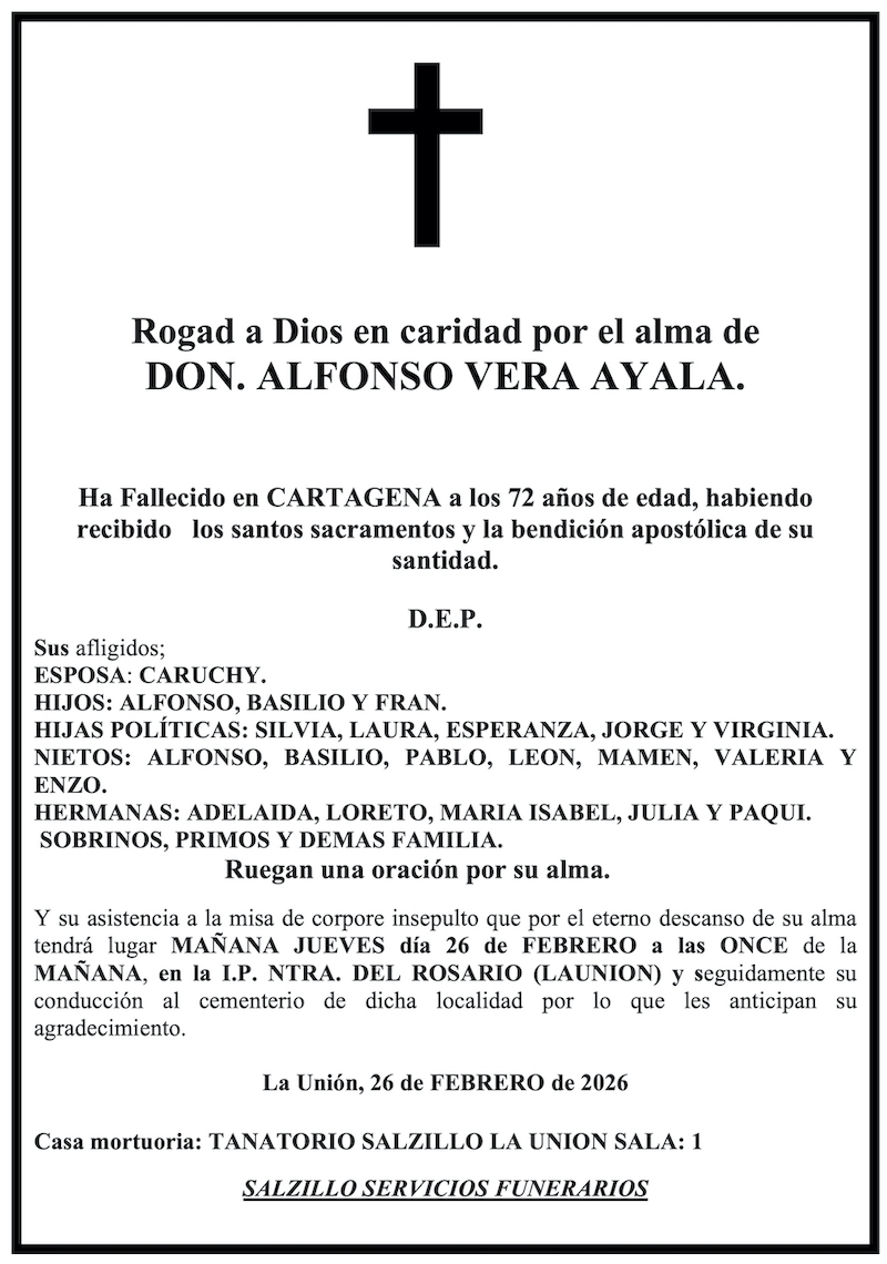 Sus afligidos esposa (Caruchy), hijos (Alfonso, Basilio y Fran), hijas políticas (Silvia, Laura, Esperanza, Jorge y Virginia), nietos (Alfonso, Basilio, Pablo, León, Mamen, Valeria y Enzo), hermanas (Adelaida, Loreto, María Isabel, Julia y Paqui), sobrinos, primos y demás familia ruegan una oración por su alma y su asistencia a la misa de 'corpore insepulto' que, por el eterno descanso de su alma, tendrá lugar este jueves, día 26 de febrero, a las once de la mañana, en la iglesia parroquial de Nuestra Señora del Rosario (La Unión) y, seguidamente, a su conducción al cementerio de dicha localidad, por lo que les anticipan su agradecimiento.