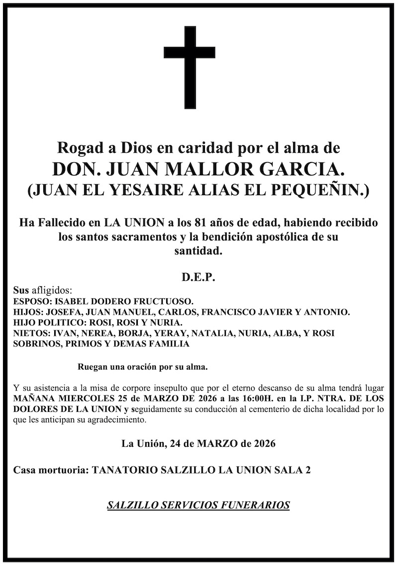 Sus afligidos esposa (Isabel Dodero Fructuoso), hijos (Josefa, Juan Manuel, Carlos, Francisco Javier y Antonio), hijo político (Rosi, Rosi y Nuria), nietos (Iván, Nerea, Borja, Yeray, Natalia, Nuria, Alba y Rosi), sobrinos, primos y demás familia ruegan una oración por su alma y su asistencia a la misa de 'corpore insepulto' que, por el eterno descanso de su alma, tendrá lugar este miércoles, 25 de marzo, a las cuatro de la tarde, en la iglesia parroquial de Nuestra Señora de los Dolores de La Unión, y, seguidamente, a su conducción al cementerio de dicha localidad, por lo que les anticipan su agradecimiento.