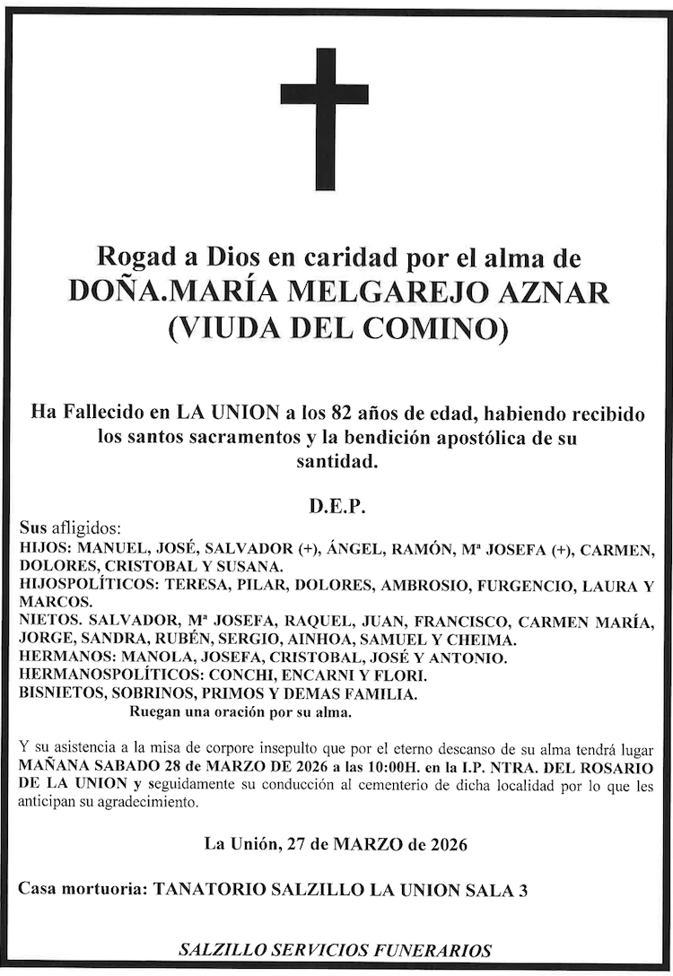 Sus afligidos hijos (Manuel, José, Salvador+, Ángel, Ramón, María Josefa+, Caremn, Dolores, Cristóbal y Susana), hijos políticos (Teresa, Pilar, Dolores, Ambrosio, Fulgencio, Laura y Marcos), nietos (Salvador, María Josefa, Raqule, Juan, Francisco, Carmen María, Jorge, Sandra, Rubén, Sergio, Ainhoa, Samuel y Chema), hermanos (Mnaola, Josefa, Cristóbal, José y Antonio), hermanos políticos (Conchi, Encarni y Flori), bisnietos, sobrinos, primos y demás familia ruegan una oración por su alma y su asistencia a la misa de ‘corpore insepulto’ que, por el eterno descanso de su alma, tendrá lugar este sábado, 28 de marzo, a las diez de la mañana, en la iglesia parroquial de Nuestra Señora del Rosario de La Unión, y, seguidamente, su conducción al cementerio de dicha localidad, por lo que les anticipan su agradecimiento.