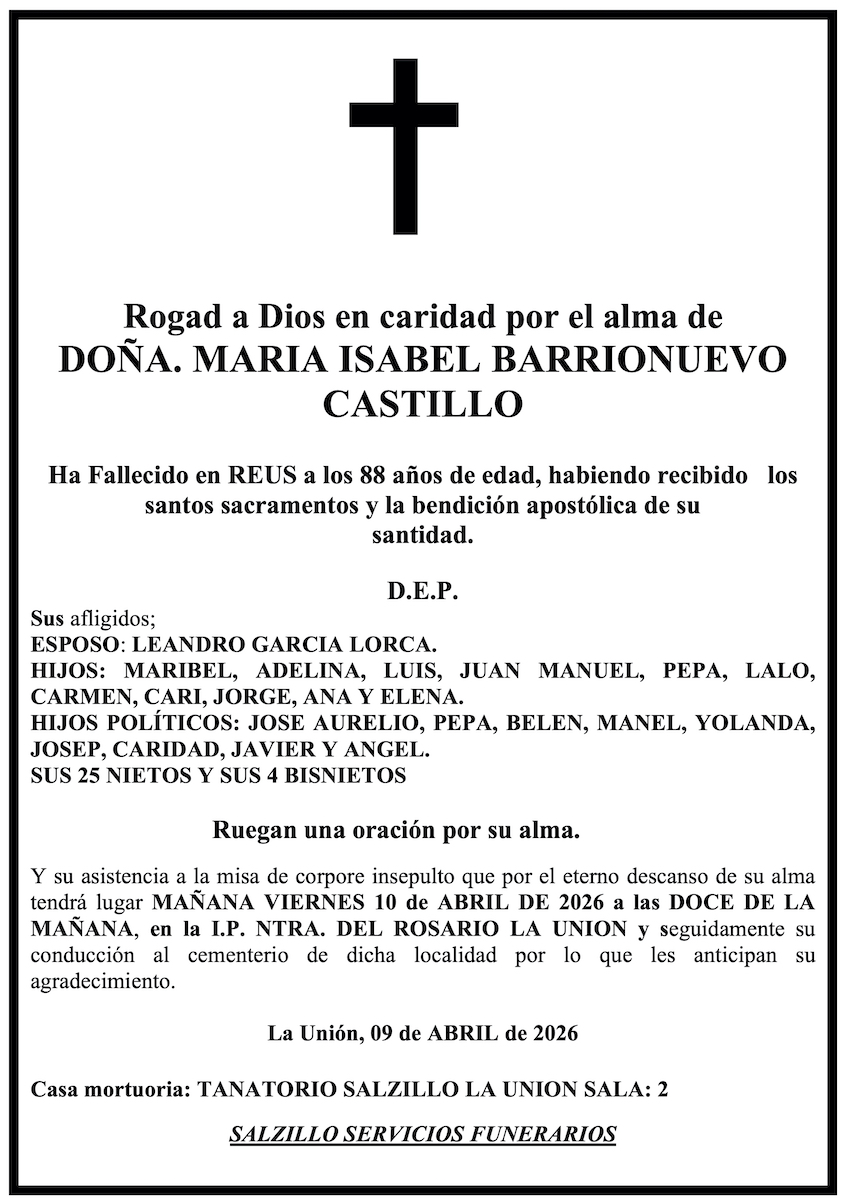 Sus afligidos esposo (Leandro García Lorca), hijos (Maribel, Adelina Luis, Juan Manuel, Pepa, Lalo, Carmen, Cari, Jorge, Ana y Elena), hijos políticos (José Aurelio, Pepa, Belén, Manel, Yolanda, Josep, caridad, Javier y Ángel), sus 25 nietos y sus 4 biznietos ruegan una oración por su alma y su asistencia a la misa de 'corpore insepulto' que, por el eterno descanso de su alma, tendrá lugar hoy, viernes 10 de abril, a las 12 horas, en la iglesia parroquial de Nuestra Señora del Rosario de La Unión y, seguidamente, a su conducción al cementerio de dicha localidad, por lo que les anticipan su agradecimiento.