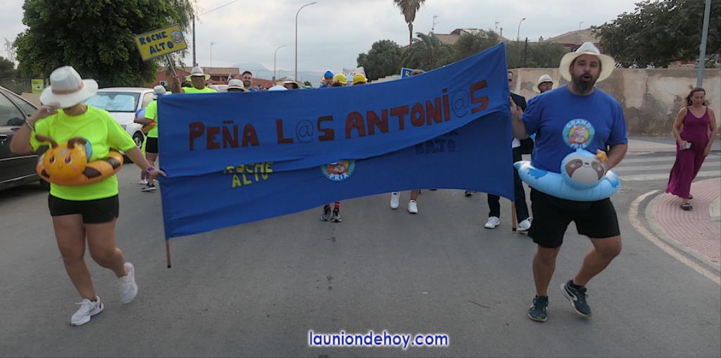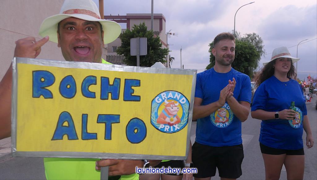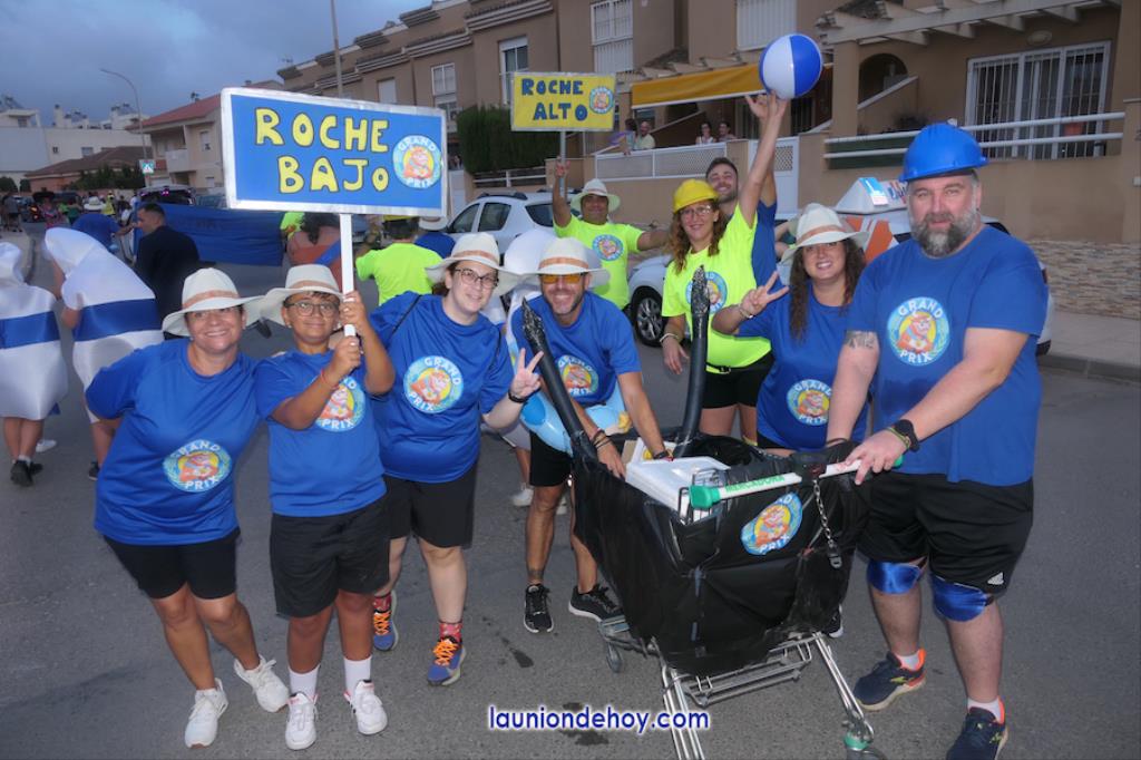 'Roche Alto' contra 'Roche Bajo' fue el duelo representado por la peña 'Los Antoni@s' en el desfile de disfraces rocheros. Ahí estuvieron, además de la alcaldesa, el presentador Ramón García, el elástico Wilbur, los bolos humanos y la vaquilla, entre otros, además de la representación de los dos pueblos con camisetas amarillas y azules con el escudo del 'Grand Prix'. El resultado es que la peña consiguió el primer premio de 100 euros del concurso de disfraces.