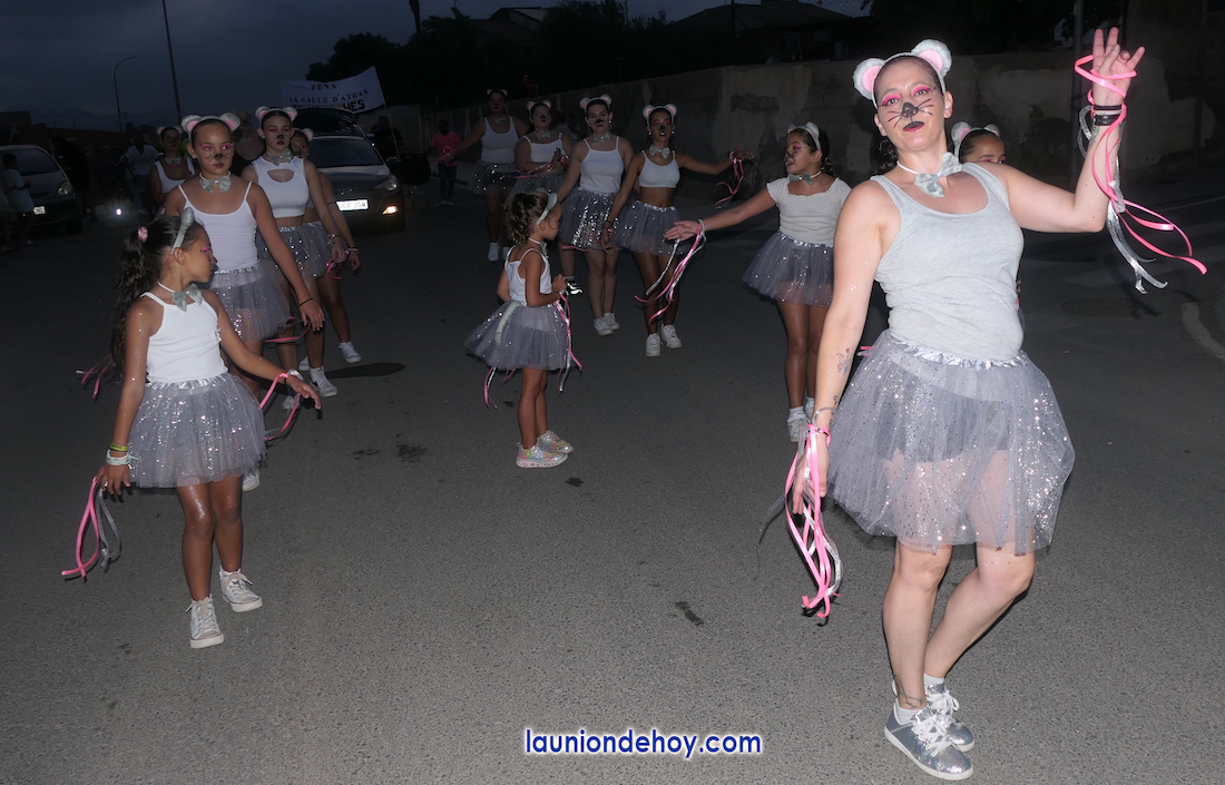 La otra peña rochera, 'la calle d'atrás', por su parte, hizo doblete con ratonas de animada coreografía y mapaches, animando un desfile que también lució un grupo practicantes de aerobic y otro de futbolistas del Real Madrid.