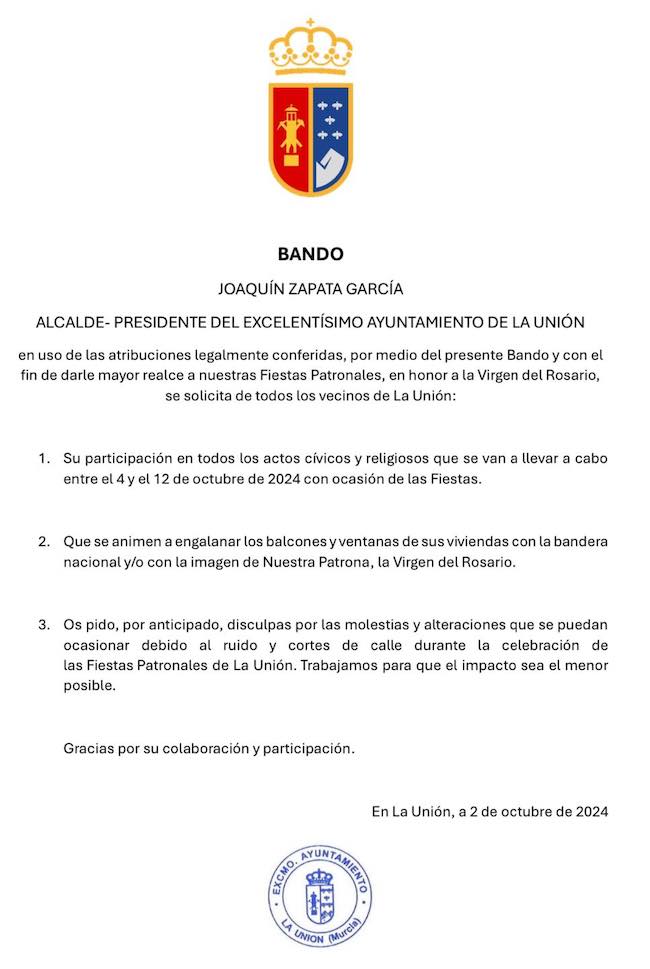 Joaquín G. Zapata García ha emitido un bando en el que, con el fin de darle mayor realce a las fiestas patronales en honor a la Virgen del Rosario que comienzan este viernes, solicita a los vecinos su participación en los actos cívicos y religiosos y les pide que engalanen balcones y ventanas con la bandera nacional y/o con la imagen de la Virgen del Rosario. También pide, por anticipado, disculpas por las molestias y alteraciones que se puedan ocasionar durante su desarrollo.