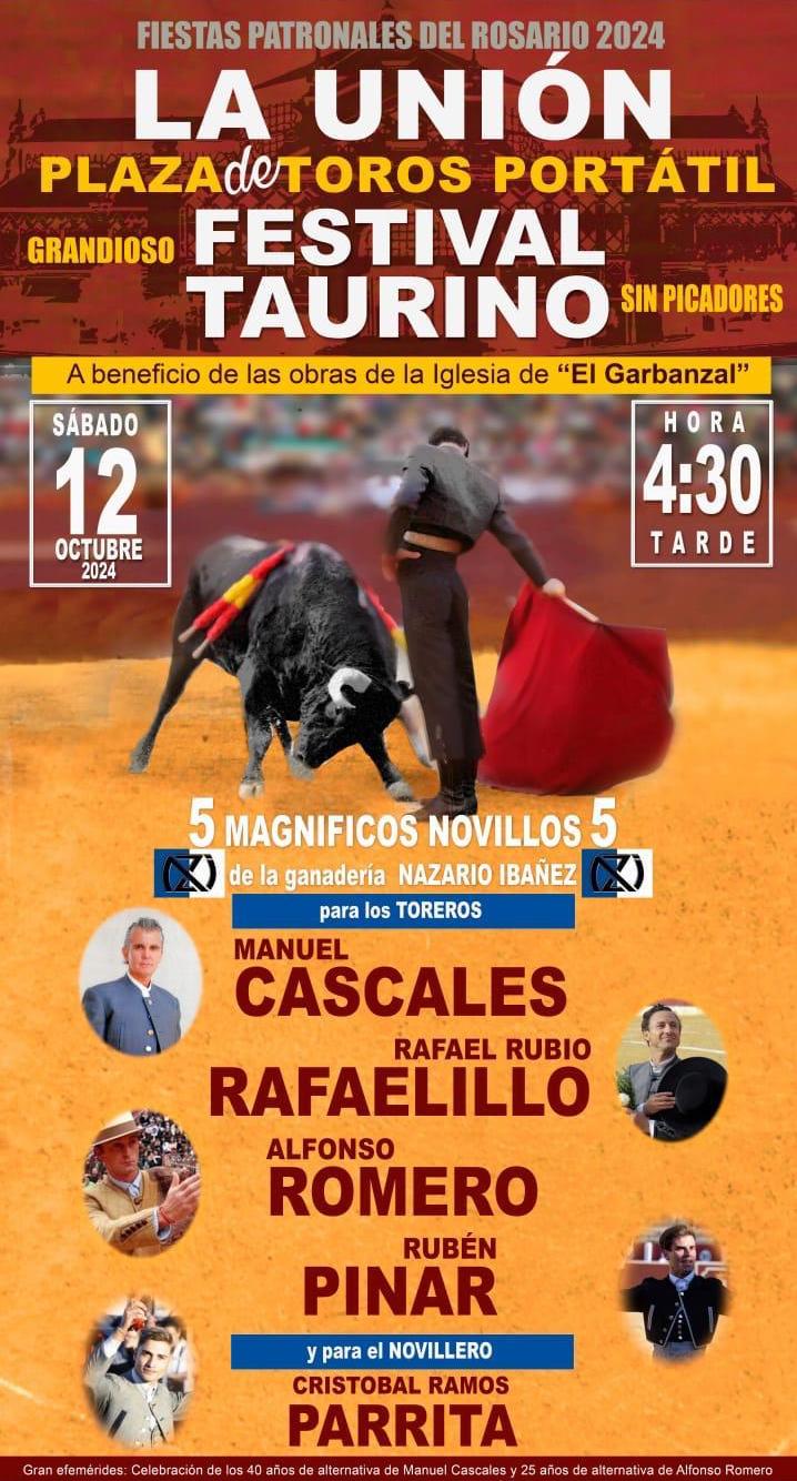 Cinco novillos de la ganadería de Nazario Ibáñez serán los que tengan como adversarios los toreros Manuel Cascales, Rafael Rubio 'Rafaelillo', Alfonso Romero y Rubén Pinar, además del novillero Cristóbal Ramos 'Parrita', en lo que será el regreso de eventos taurinos a La Unión después de muchos años. No habrá picadores. La entrada general cuesta 20 euros y la numerada de barrera vale 35 euros. El dinero recaudado tendrá como destino el arreglo de la iglesia de El Garbanzal. La hora de inicio son las 16.30 del 12 de octubre.