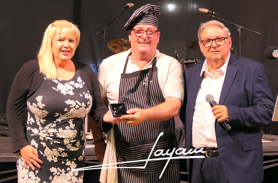 Premio para la Agrupación Santísima Virgen de la Caridad, recogido por su presidente (y cocinero), Alfonso Pagán López, y recogido por la primera teniente de alcalde del gobierno local, Teresa López.
