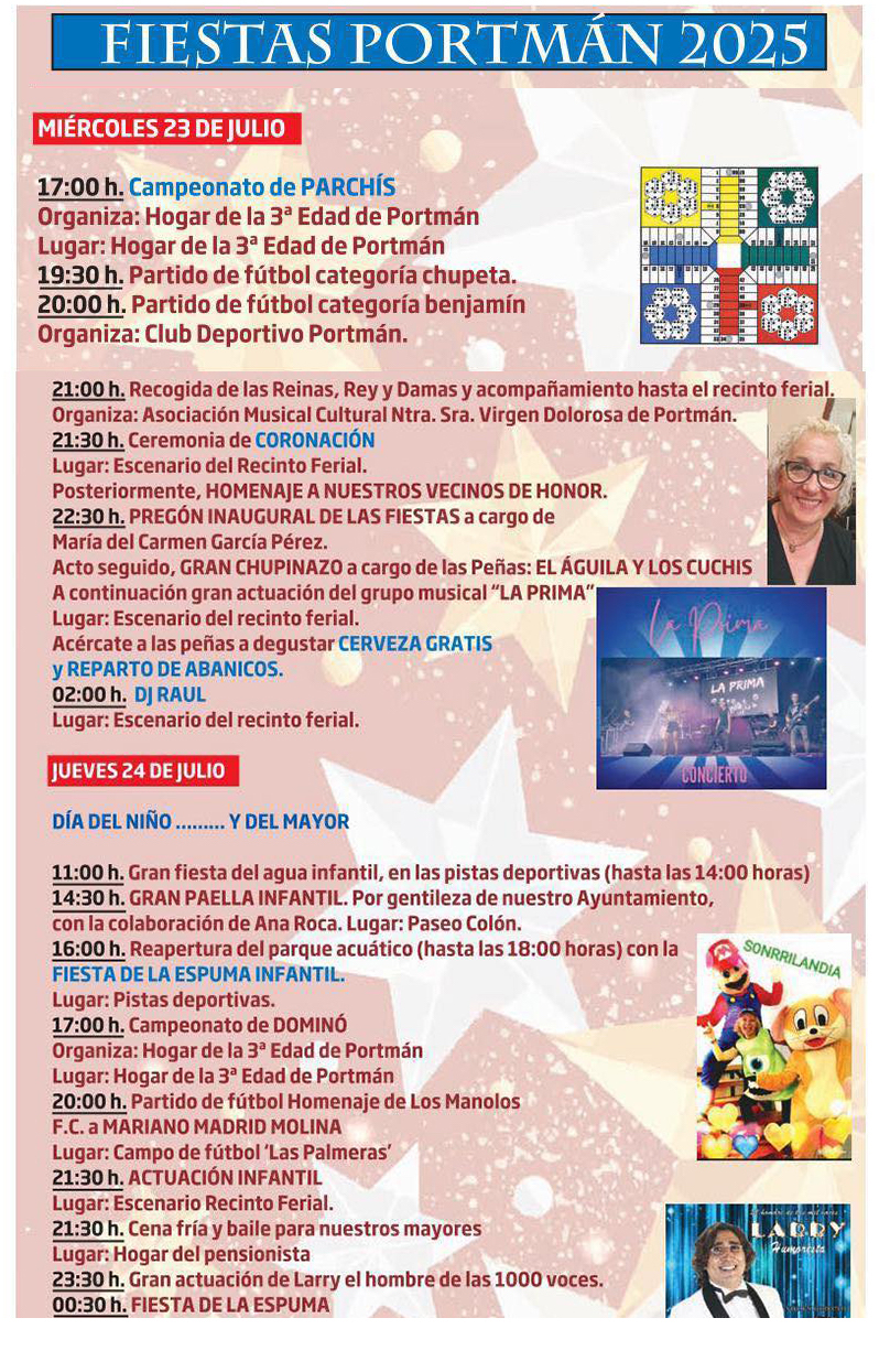 Las fiestas patronales inician hoy el grueso de su programación con la coronación de la corte real y el pregón de María del Carmen García, secretaria de la asociación de vecinos. Antes hay inicio del torneo de parchís y partidos de fútbol y después actuarán la banda musical 'La prima' y DJ Rául. Las dos peñas locales regalarán abanicos portmaneros. La Policía Local informa que está prohibido estacionar en el entorno del nuevo recinto festero. En la foto, el cartel de esta edición y la reina y damas juveniles