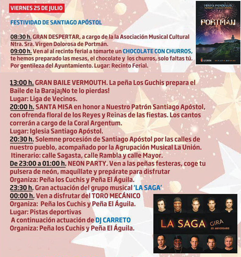 Hoy, festividad local en el municipio de La Unión, el epicentro está en las fiestas patronales de Portmán, con madrugador despertar en una jornada que ofrece degustación de chocolate con churros, baile del vermú, misa, procesión, 'Neon Party', concierto de 'La Saga', toro mecánico y cierre con DJ Carreto.