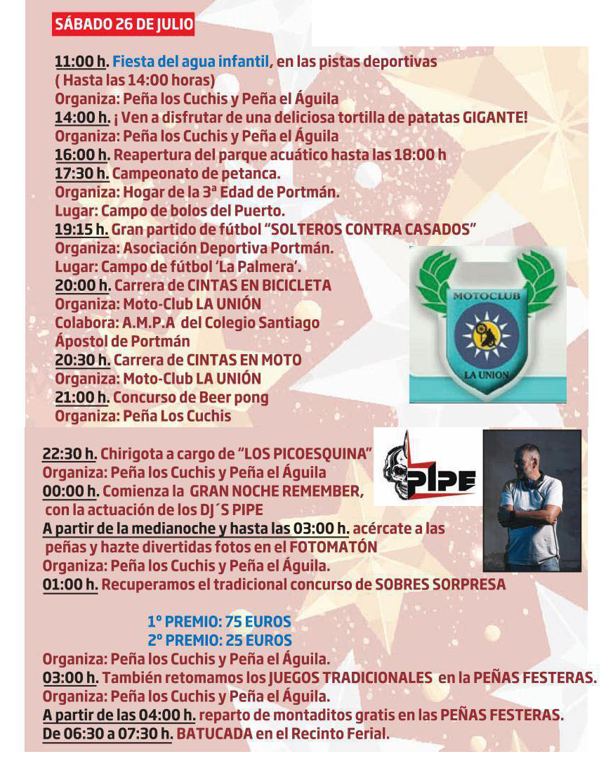 Penúltimo día de las fiestas en honor a Santiago Apóstol cuya actividad comenzará con una matinal fiesta del agua infantil y que tendrá a la hora de comer una tortilla de patatas gigante. Por la tarde llegarán el torneo de petanca, el duelo balompédico entre solteros y casados, las carreras de cintas en bicicleta y en moto y el concurso de ‘Beer pong’, para en la noche pasar por el escenario la chirigota de ‘Los picoesquina’ y DJ Pipe.
