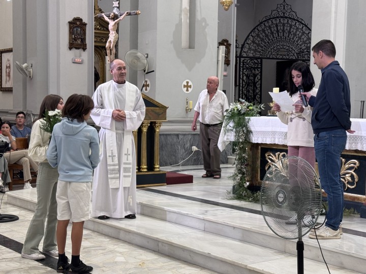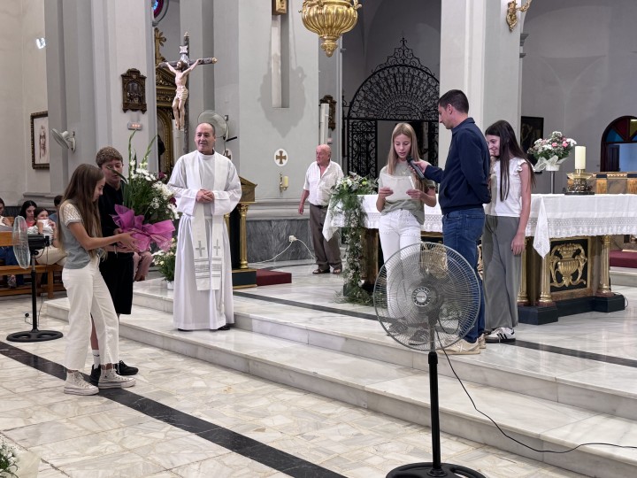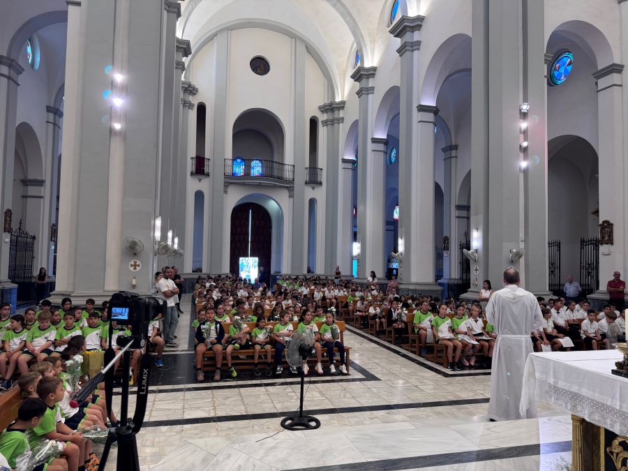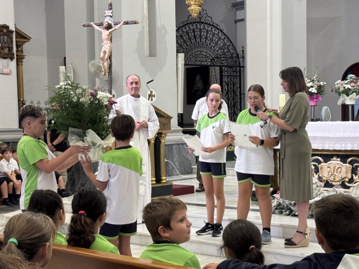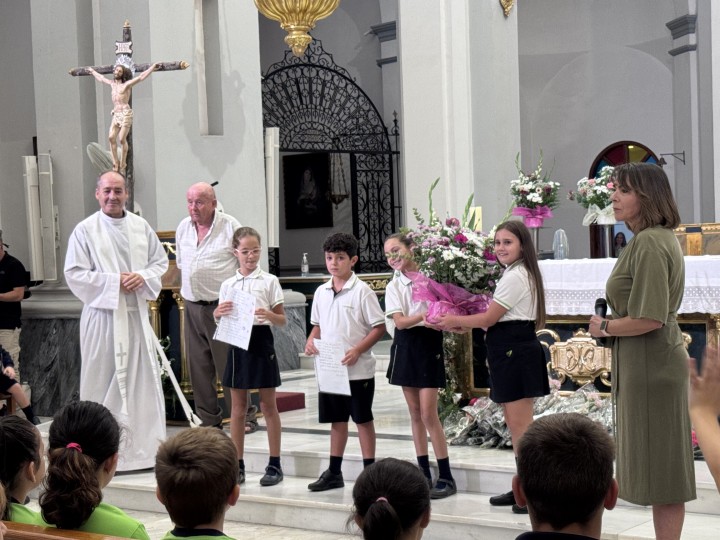 Las fiestas en honor a Nuestra Señora del Rosario acogieron su primer acto del programa oficial con el encuentro de los escolares con la patrona en el templo, donde se llevó a cabo la tradicional ofrenda floral.