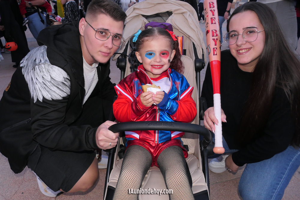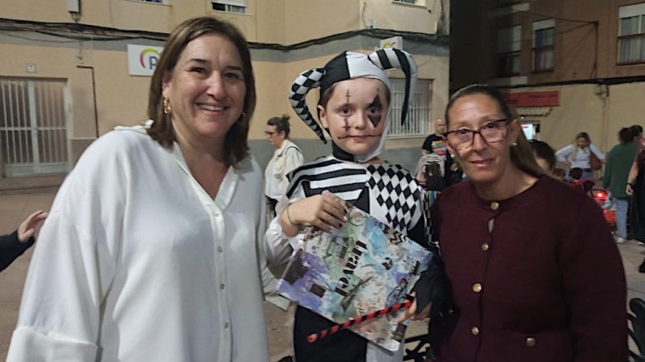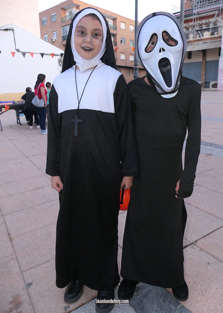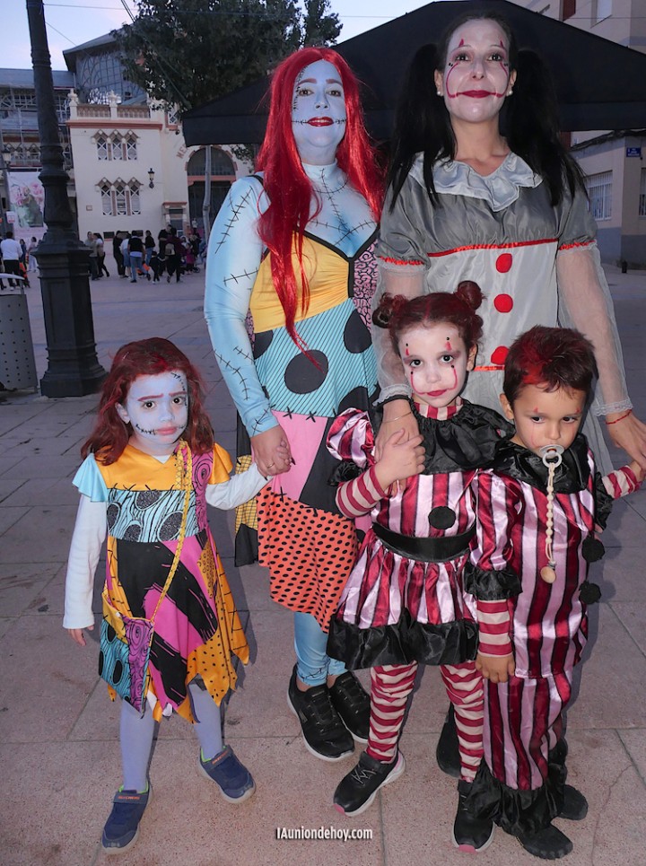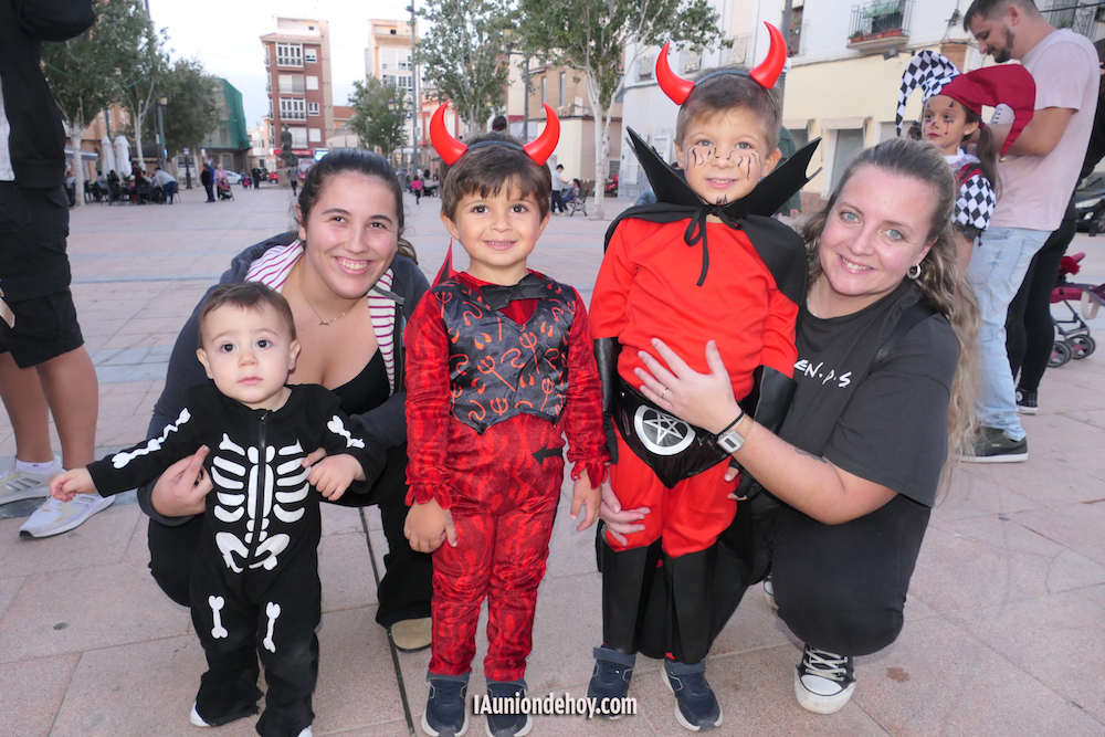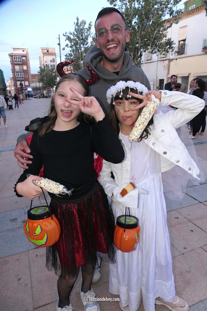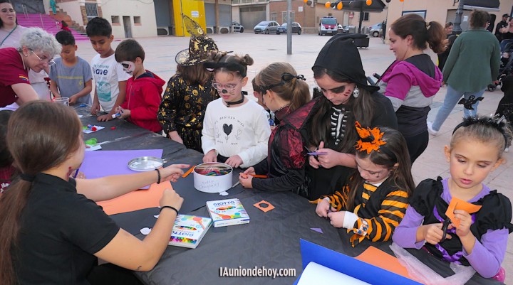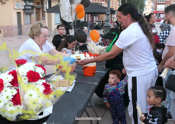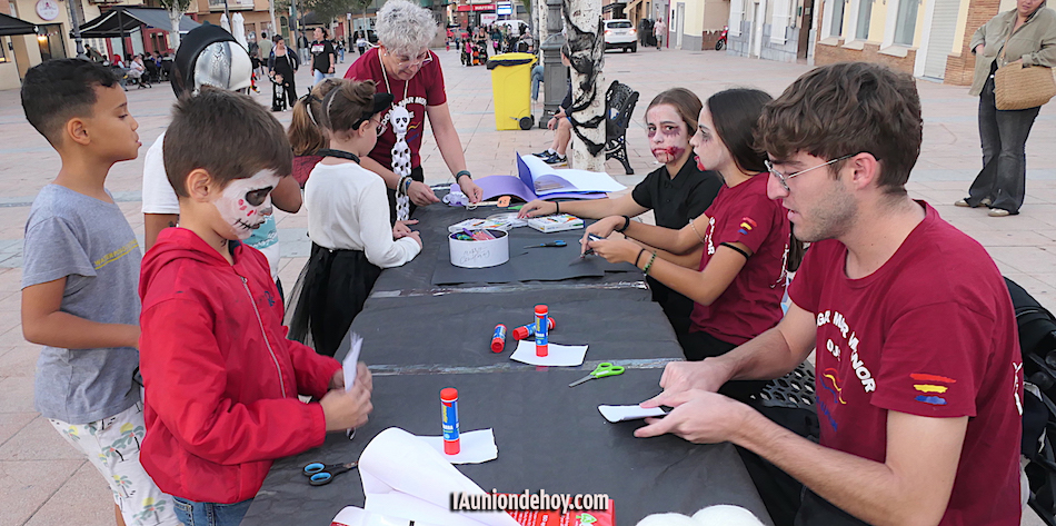 Niños (y algunos mayores) ataviados con terroríficos disfraces participaron en la fiesta de terroríficos muertos que se desarrolló ante la fachada del modernista Mercado Público, donde hubo dos mesas instaladas. En una se llevaban a cabo manualidades coordinadores por la Organización de Jóvenes Españoles (OJE), mientras que la otra era la gastronómica con reparto de bolsas de palomitas y de los sabrosos bizcochos caseros. La tarde también tuvo concurso de disfraces, reparto de premios y regalos a los participantes.