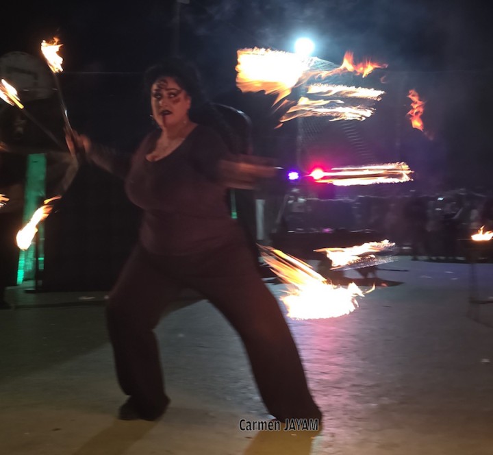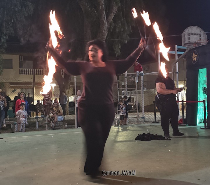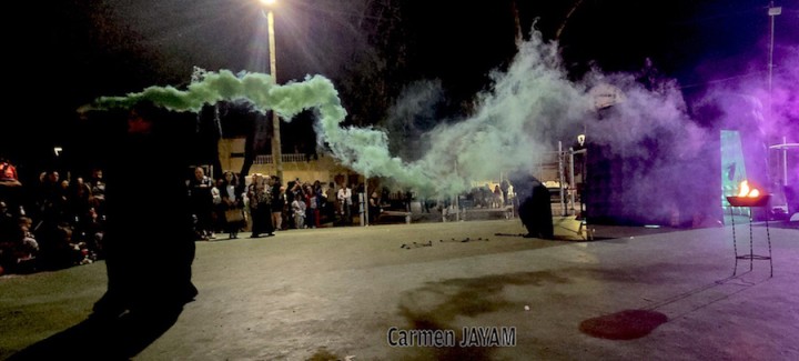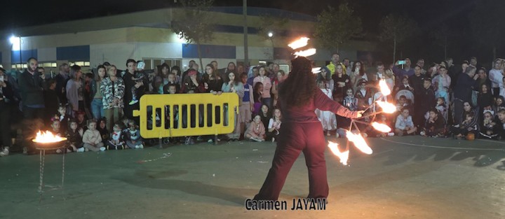 El punto de partid¡a ha sido el ‘Vídeo 360’, para a continuación tener lugar en la pista polideportiva un espectáculo de fuego con dos damas negras de ‘Animaciones Marín’.