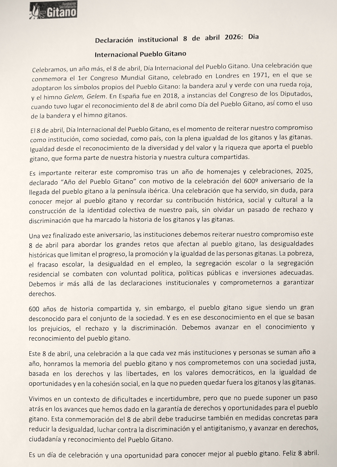 Esta celebración, coordinada por la concejalía municipal de Servicios Sociales, ha sido subvencionada dentro del 'Plan de desarrollo del pueblo gitano' de la Comunidad Autónoma Región de Murcia. El consistorio contrató una empresa privada, cuyos jóvenes coordinaba los diferentes puestos y actividades, para la organización de la edición de este año, en el que el epicentro fue la plaza de Joaquín Costa, a diferencia del ejercicio anterior, cuando el manifiesto se leyó en un pabellón. El programa de 2026 se completa con un taller de percusión hoy, a las 16.30 horas, en la plaza del Cante de las Minas, en la barriada de San Gil.