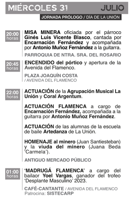 La exposición 'Pilares del flamenco' ha abierto el programa de la jornada prólogo del 63 festival internacional flamenco, que esta tarde continúa, a partir de las 20 horas, con la misa minera, el encendido del pórtico, la gala en la 'Catedral del Cante' dedicada a La Union (entrada gratuita) y la primera 'madrugá flamenca'.